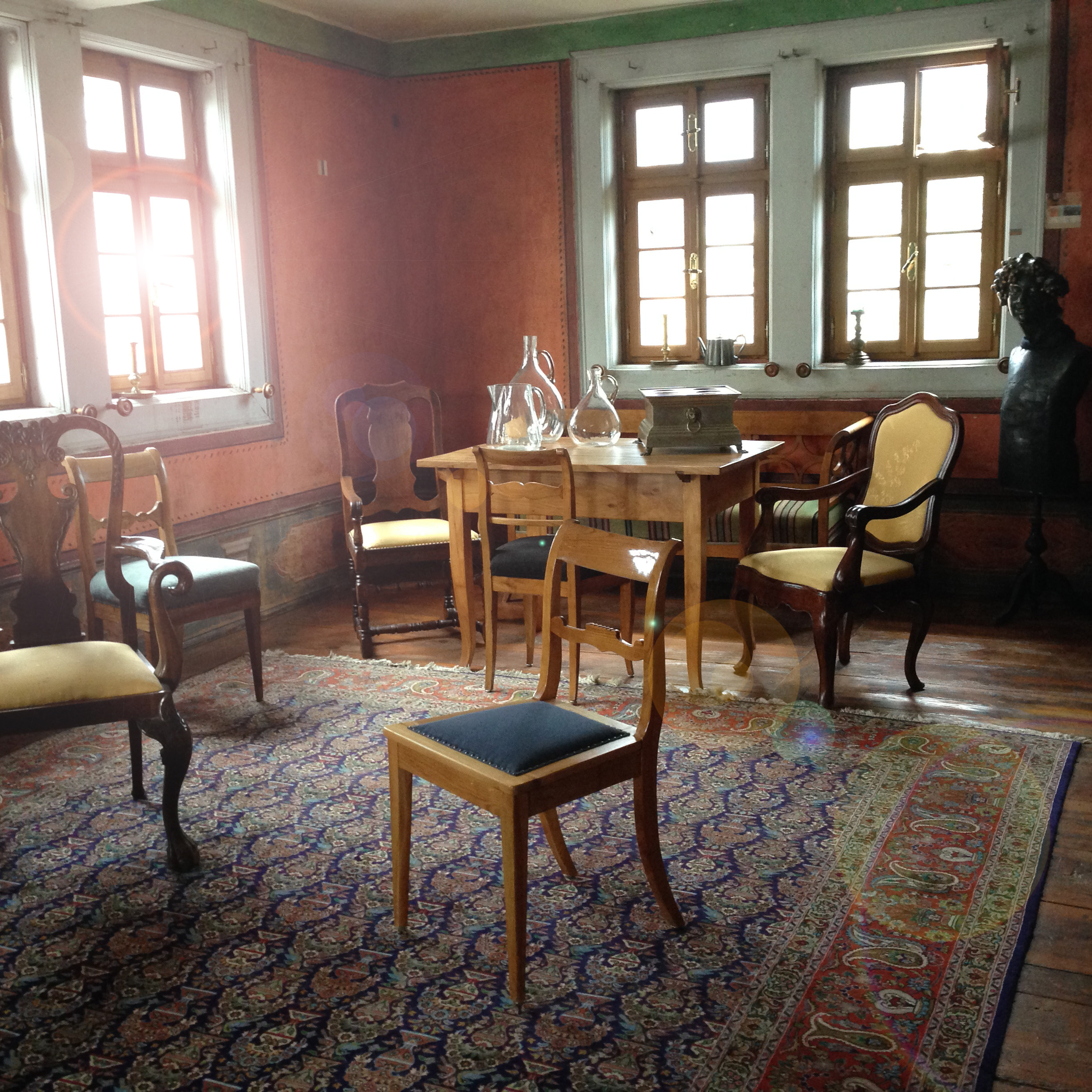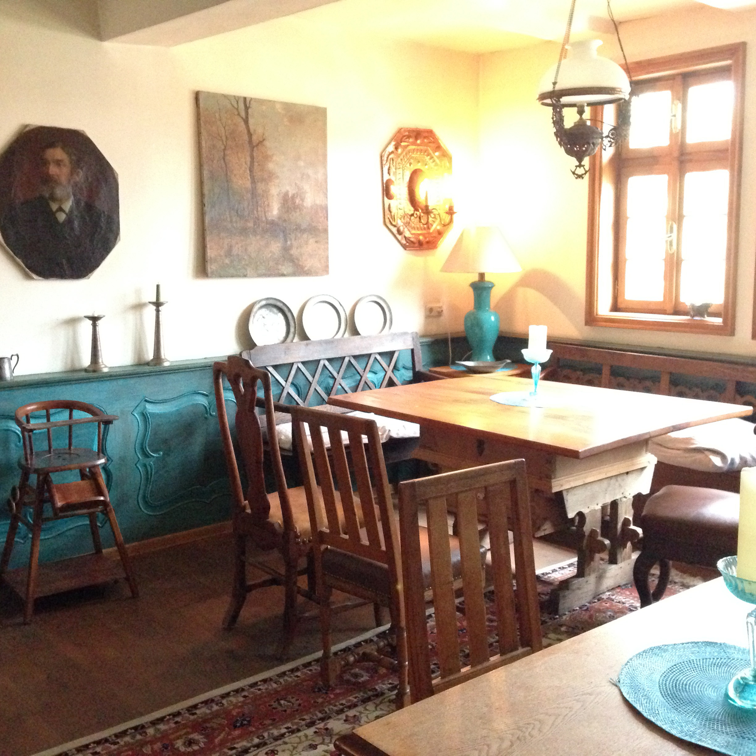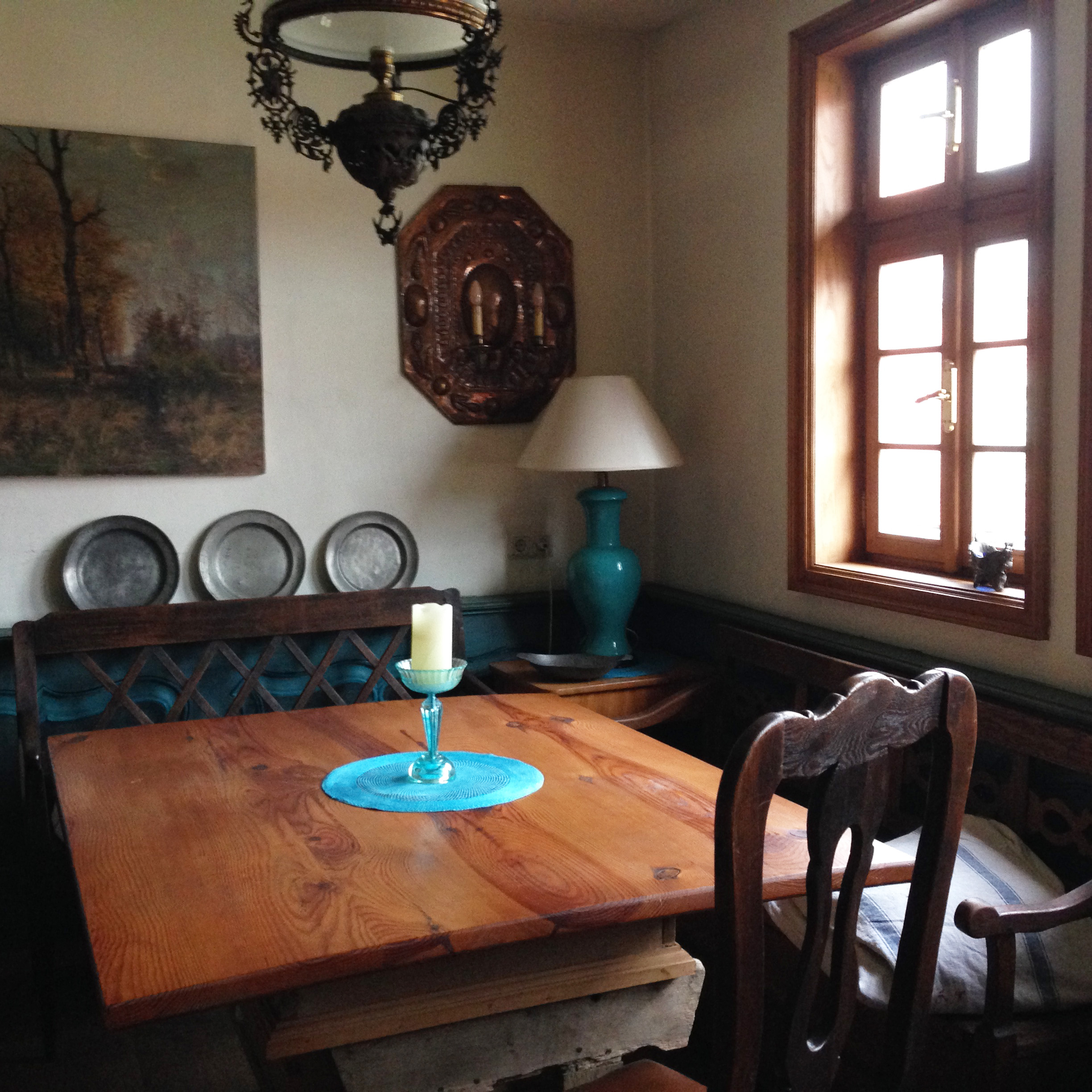 Heute kann ich vom zartgrünen Salon im Erdgeschoss, zur guten Stube im ersten Stock wandeln. Es gibt ein rotes Zimmer, eines mit türkisen Akzenten. Poliertes Kirschholz im sanft geschwungenen Geschmack des biedermeierlichen Bürgertums findet sich verteilt auf verschiedene Essgruppen in den Salons. Heute ein Restaurant . Vor dem Fenster befindet sich ein ordentlich angelegter Nutzgarten. Den schmecke ich später auf dem Teller. In der alten Küche mit dem mächtigen Herd in der Mitte kochen sie ganz vorzügliche Landküche, der Spargel und die Kalbsschnitzel, die wir neulich im Kleegarten gegessen haben, waren jedenfalls sehr lecker.