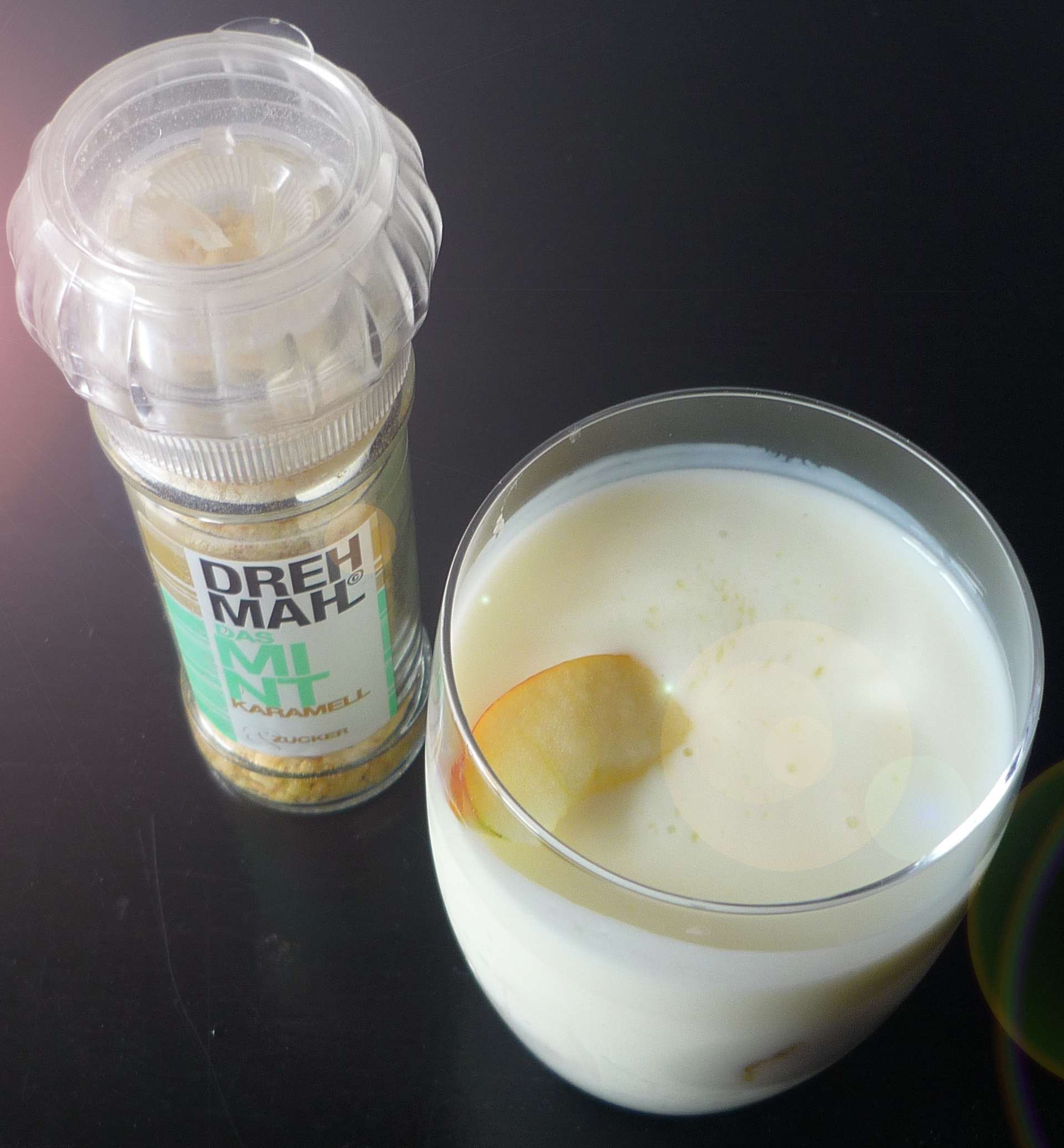 Diesen Mittwochmorgen begegne ich dem Problem kulinarisch und mache mir einen Smoothie. Erstens geht die Lebensverschönerung relativ schnell. Alles, was ich tun muss, ist eine oder zwei Obstsorten auswählen (Heute Banane), Gemüsesorten gehen auch, finde ich aber meistens aber nicht so lecker; eine Basis nehmen, das kann Milch, Butter-, Mandel-, oder Kokosnussmilch, sein, Sojawasser oder Direktsaft (Ich: Buttermilch, die ist nicht so süß aber schön cremig). Wenn man möchte, kann noch ein Dickmacher dazu: Eis zum Beispiel oder das Fruchtfleisch der Kokosnuss, . Also alles, was das Ganze hinterher cremig-lecker macht (Brauche ich nicht, meine Buttermilch ist schon cremig.) Außerdem darf ein bisschen Aroma obendrauf: Ahornsirup, Honig, Zimt. (Ich nehme heute ein bisschen Karamellzucker, dann schmeckt das Endprodukt ein bisschen süßer.) Zum krönenden Abschluss lege ich obendrauf ein Deko-Obst. (In meinem Fall ein Apfelschnitz. Den brauche ich aber eigentlich nur um das Getränk zum Schluss einmal bewundern fotografieren zu können. Bis ich den Apfel erwischt habe, gestaltet sich das Trinken danach ein bisschen wie eine Schnitzeljagd.)