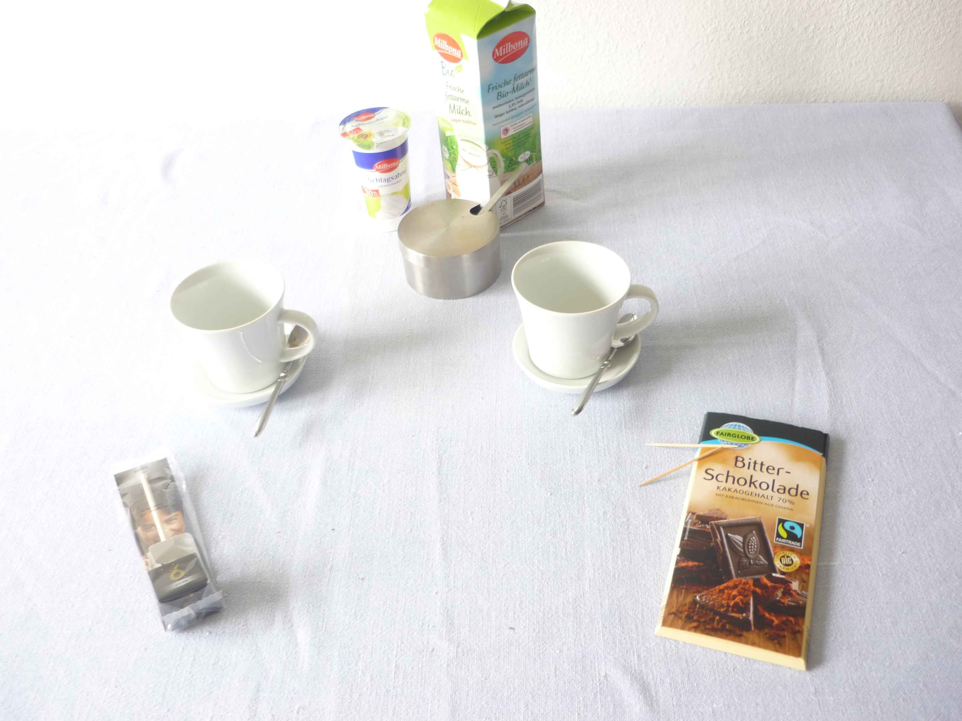 Zuerst besorge ich extra so einen Trinkschokoladen-Lolli, wie ihn kleine feine Spezialitäten-Läden bereit halten, ich nehme die Sorte Zartbitter, dazu Milch, Schlagsahne, Schokoladenpulver zum oben drauf streuen.