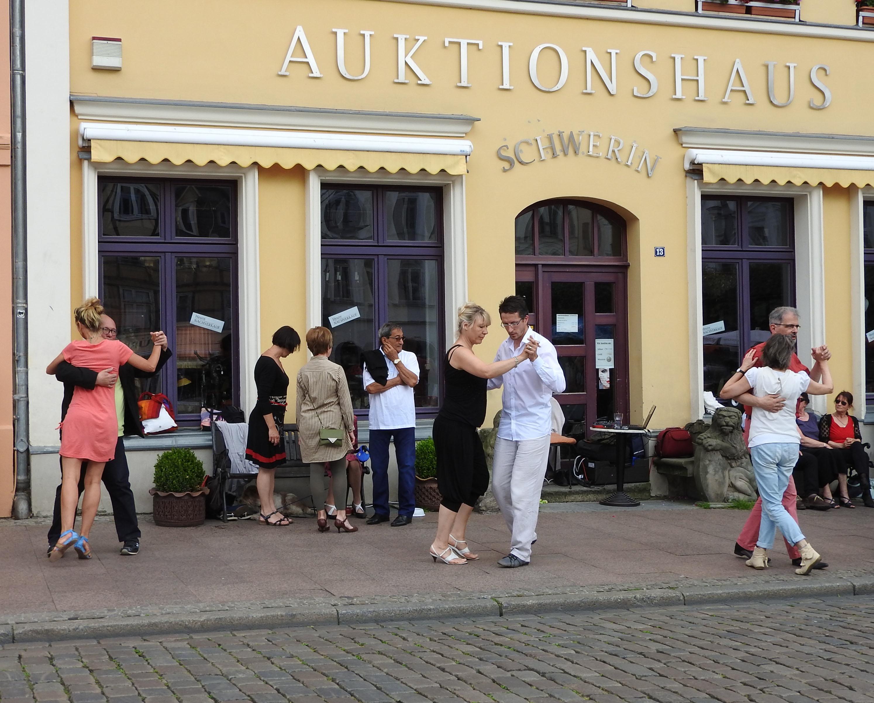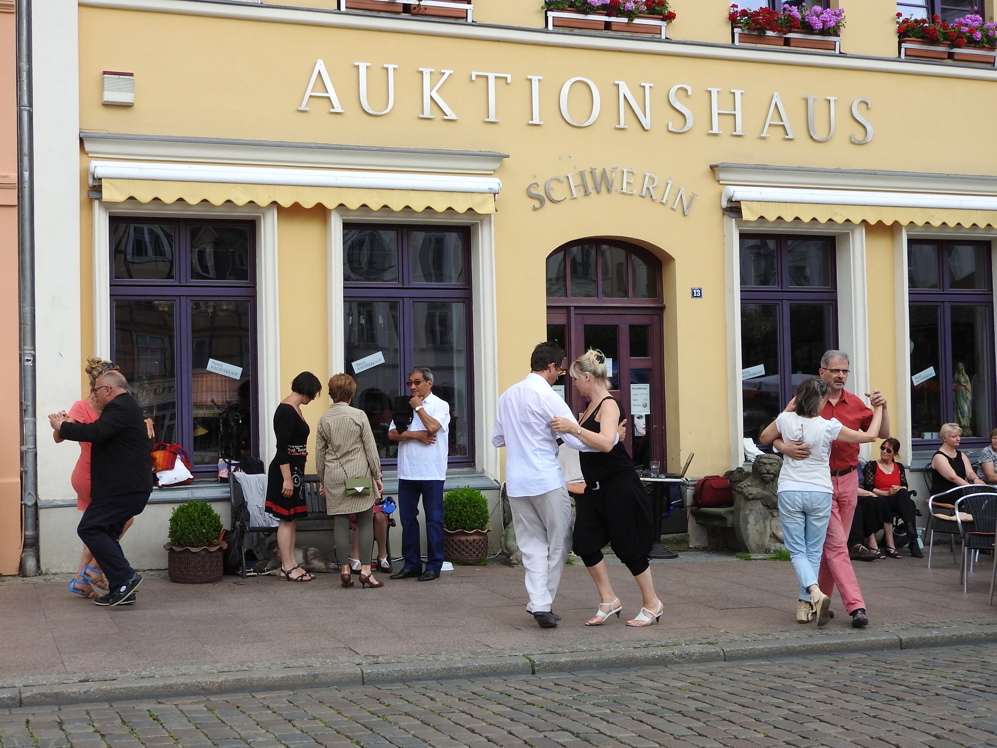 Das Schöne an so einer kleinen, fast möchte man sagen, winziges Residenzstadt: Es lässt sich prima vor und zurück spazieren, vom Schloss auf dem See kreuz und quer zum Dom, weiter zu Pfaffenteich mit dem Waffenarsenal, wieder zurück, am Schloss vorbei in Richtung Fauler See (jaaa, der heißt wirklich so) über das Gelände der Bundesgartenschau. Zwischendurch schauen wir am Marktplatz Tangotänzern zu, die in der nachmittäglichen Sonne, ein bisschen Leben ins verträumte Kleinstadtleben bringen. So verträumt Straßen und Gässchen gelegentlich wirken, an Café und Restaurant mangelt es nicht.**