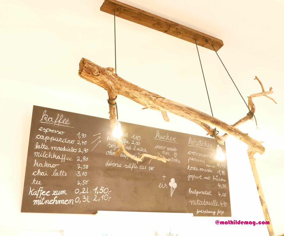 Das Drumherum: Hell, weiß, klar mit ein bisschen Deko-Zauber. In meiner eigenen Wohnung müsste ich keine Äste von der Decke baumeln lassen, aber in den halb-öffentlichen Raum eines Cafés passt es. Genauso wie die kleinen weißen Vasen mit roten Beerenzweigen drin, die auf den Betontischen stehen.