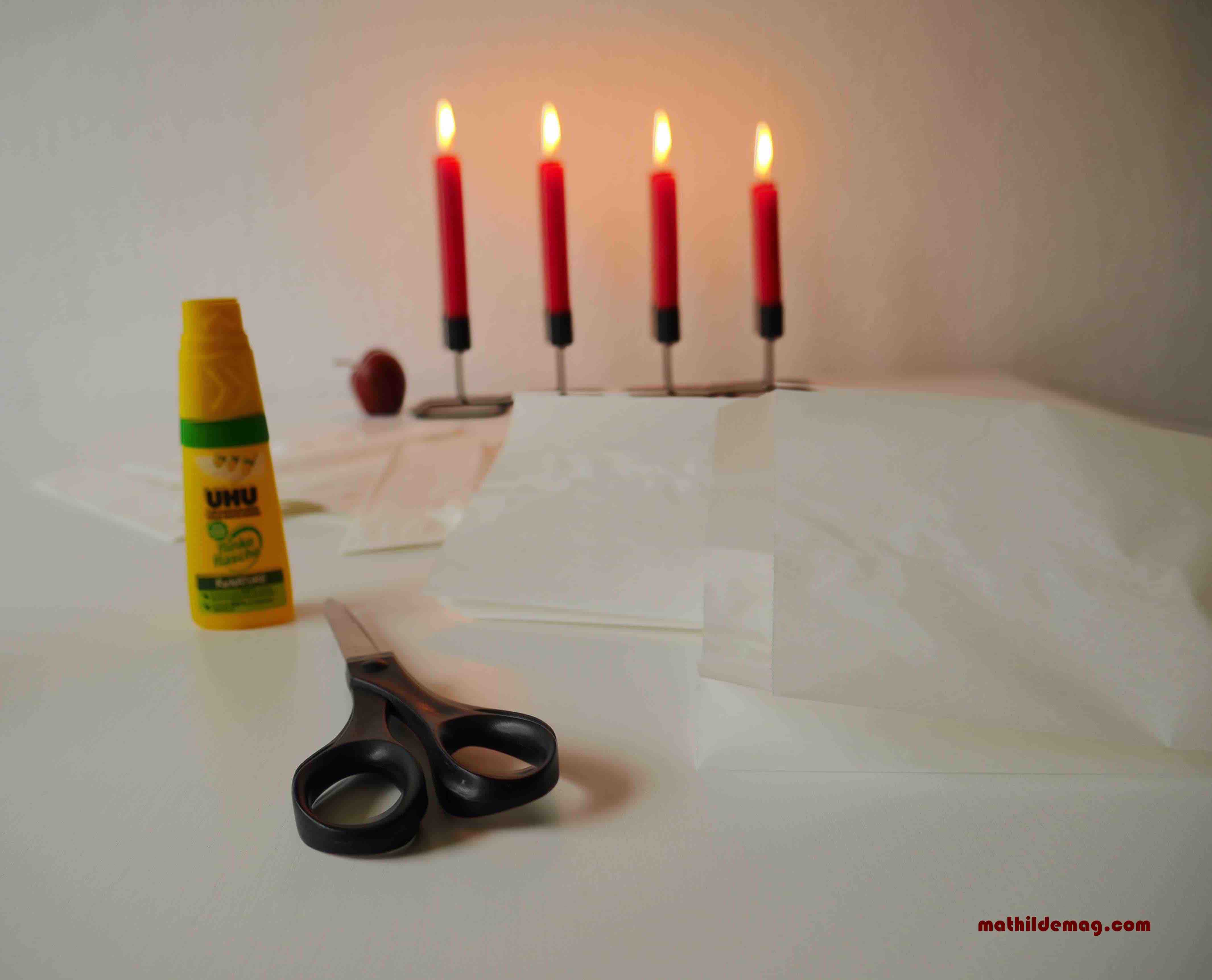 Anschließend kleben Sie die erste und letzte Tüte zusammen. Dann lochen Sie ein kleines rundes Loch mit dem Papierlocher aus, fädeln Bindfaden hindurch …. und tadaah, fertig ist die Winterstimmung.