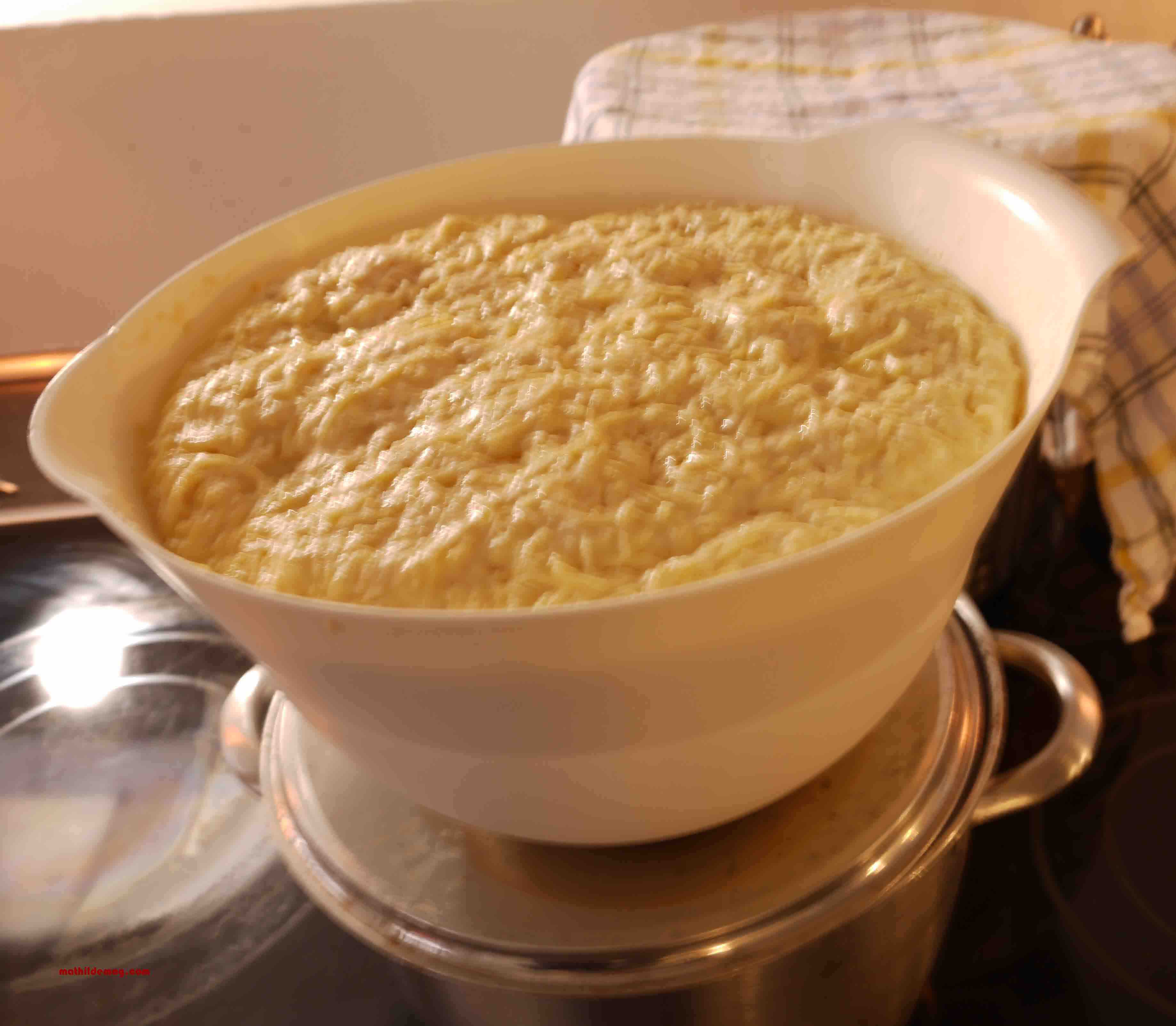 Anschließend haben wir einen Topf mit Wasser aufgesetzt. Nachdem das gekocht hatte, haben wir die Herdplatte ausgestellt, unseren frischen Teig oben auf den warm dampfenden Topf Wasser gestellt und den Teig etwa eine halbe Stunde gehen lassen. Bis er oben am Schüsselrand angekommen war.