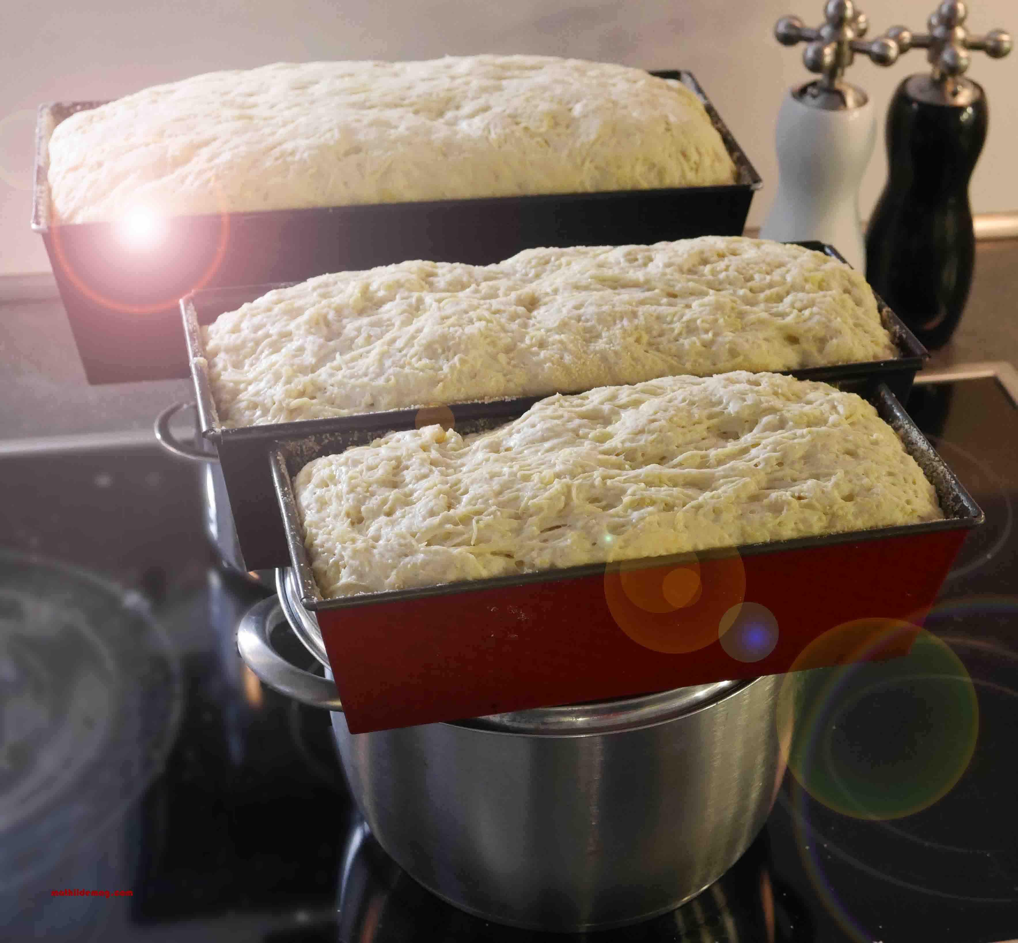 Anschließend haben wir die Topf-mit-heißem-Wasser-Prozedur wiederholt und den Teig ein zweites Mahl gehen lassen. Wieder so lange bis er oben angekommen war.